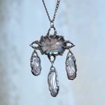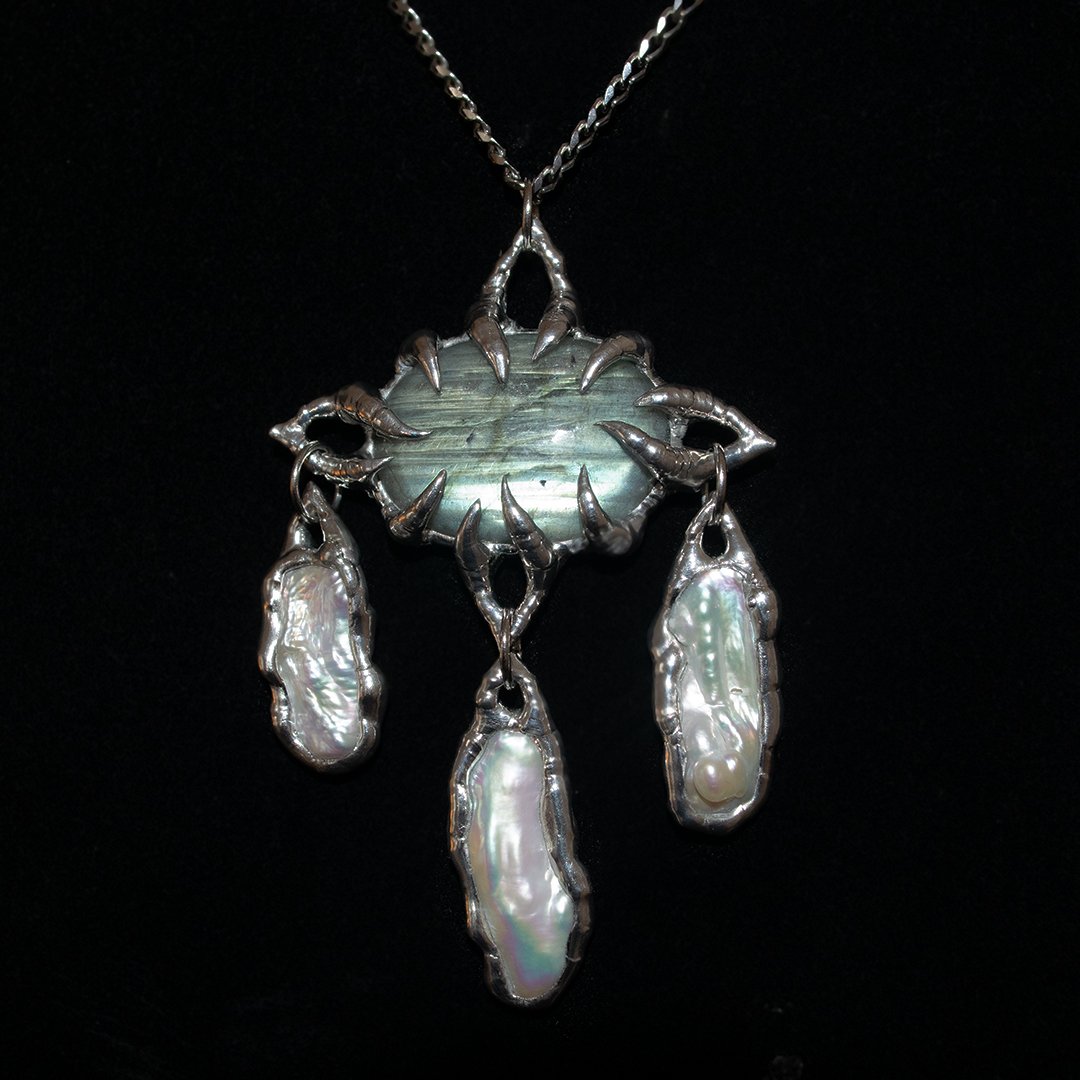 Made with a radiant piece of labradorite, biwa pearls, lead-free tarnish-resistant solder (silver & tin) & 304 stainless steel chain/findings.