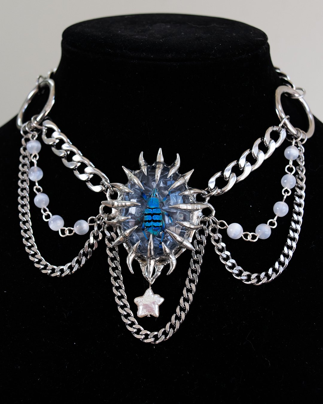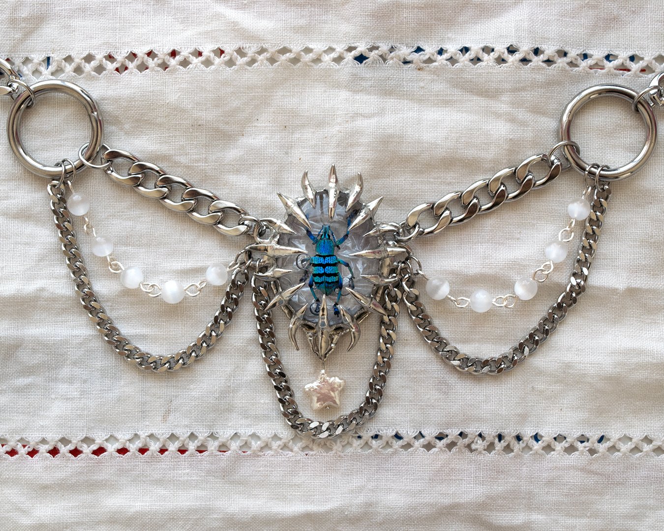 Made with a Eupholus schoenherri weevil (pinned, dried for several months, and preserved in resin), lead-free tarnish-resistant solder (silver & tin), selenite beads, a pearl star, and 304 stainless steel chain/findings.