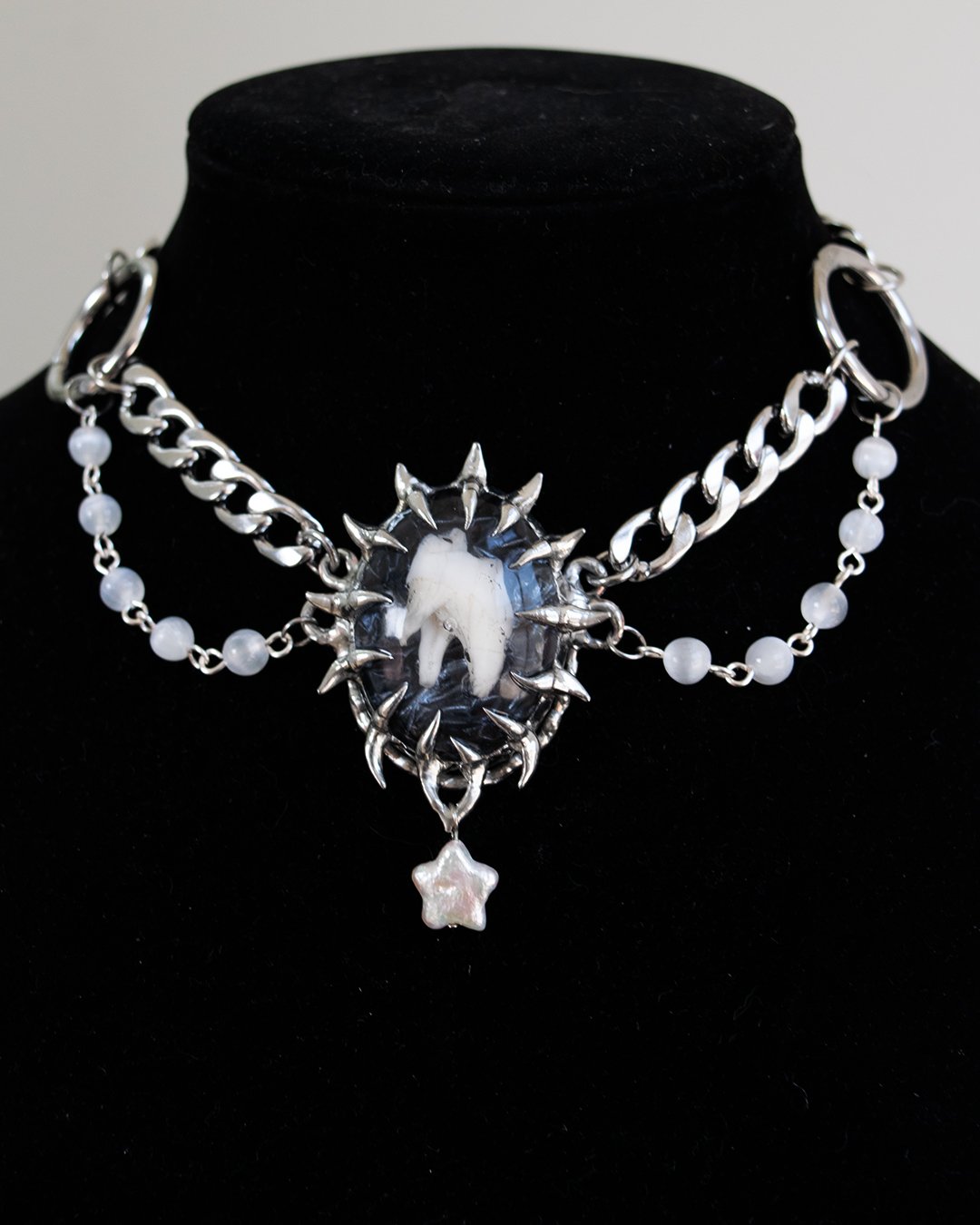 Made with a hog's tooth preserved in resin, lead-free tarnish-resistant solder (silver & tin), selenite beads, a pearl star, and 304 stainless steel chain/findings.