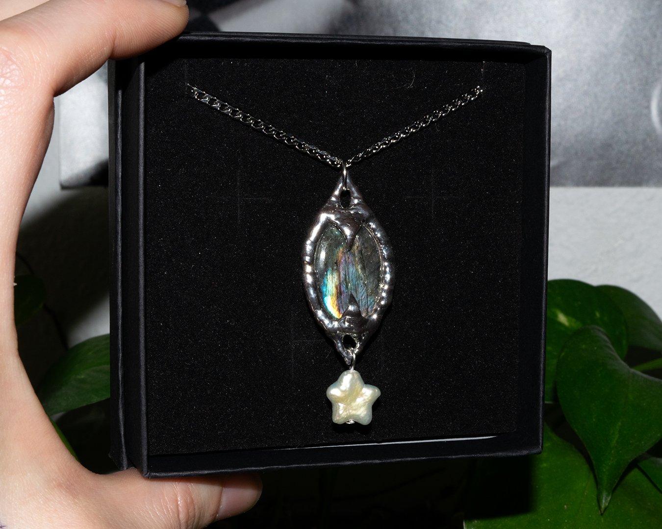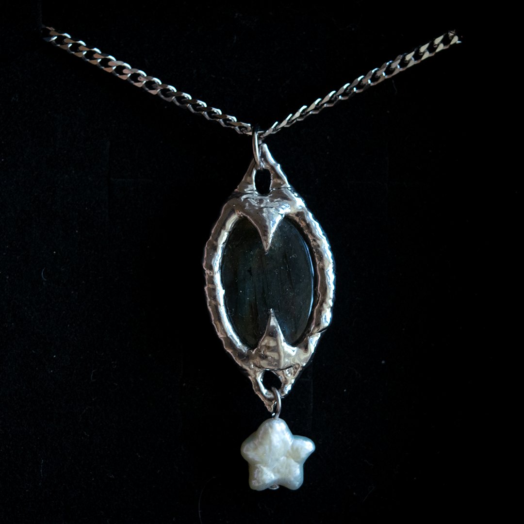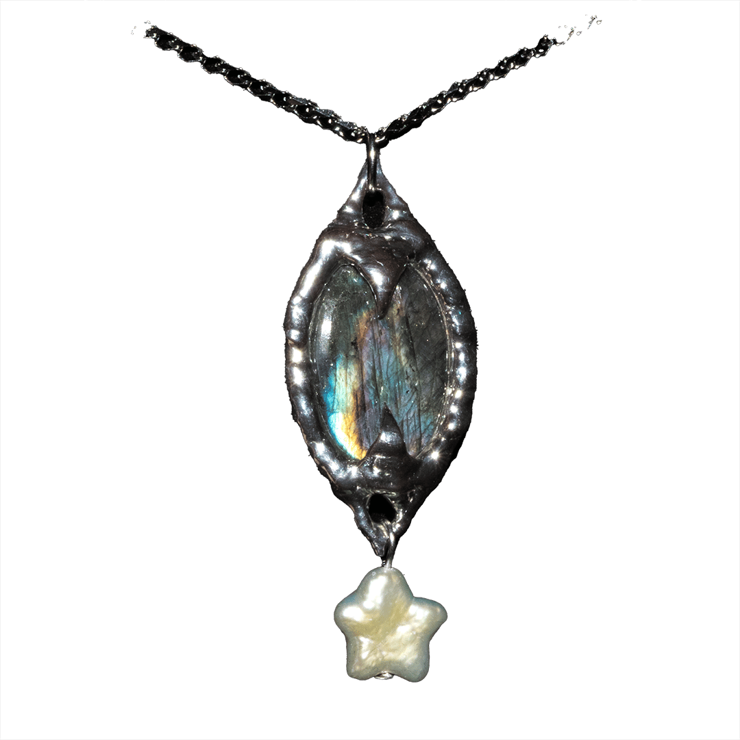 Made with a piece of spectrolite labradorite, a pearl star, lead-free tarnish-resistant solder (silver & tin) & 304 stainless steel chain/findings.