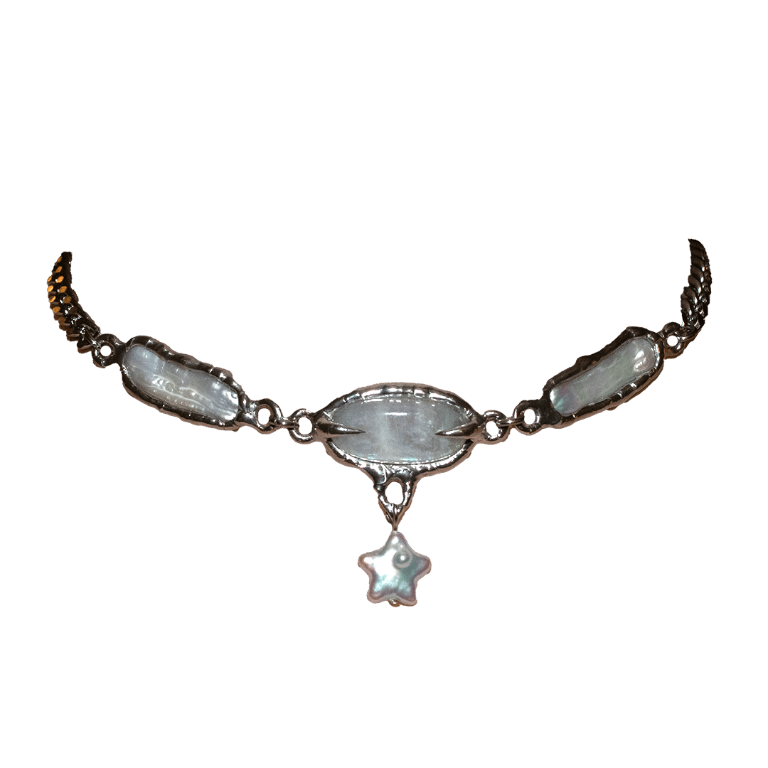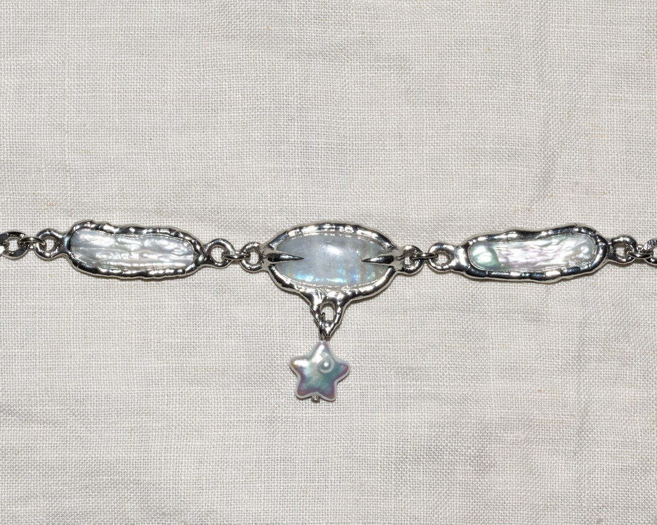 Made with a beautiful piece of moonstone, biwa pearls, a star pearl, lead-free tarnish-resistant solder (silver & tin) & 304 stainless steel chain/findings.