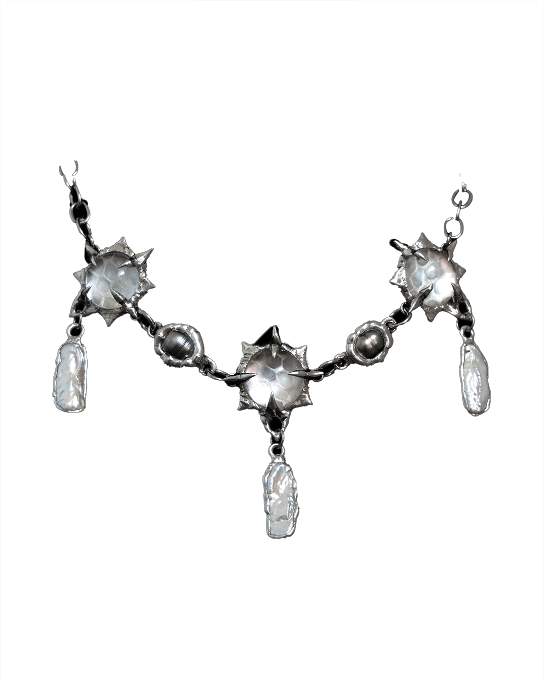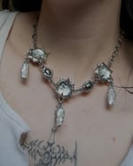 Made with the shed of a snake named Bubble preserved beneath a glass domes, peacock and biwa pearls, lead-free tarnish-resistant solder (silver & tin) & 304 stainless steel chain/findings.