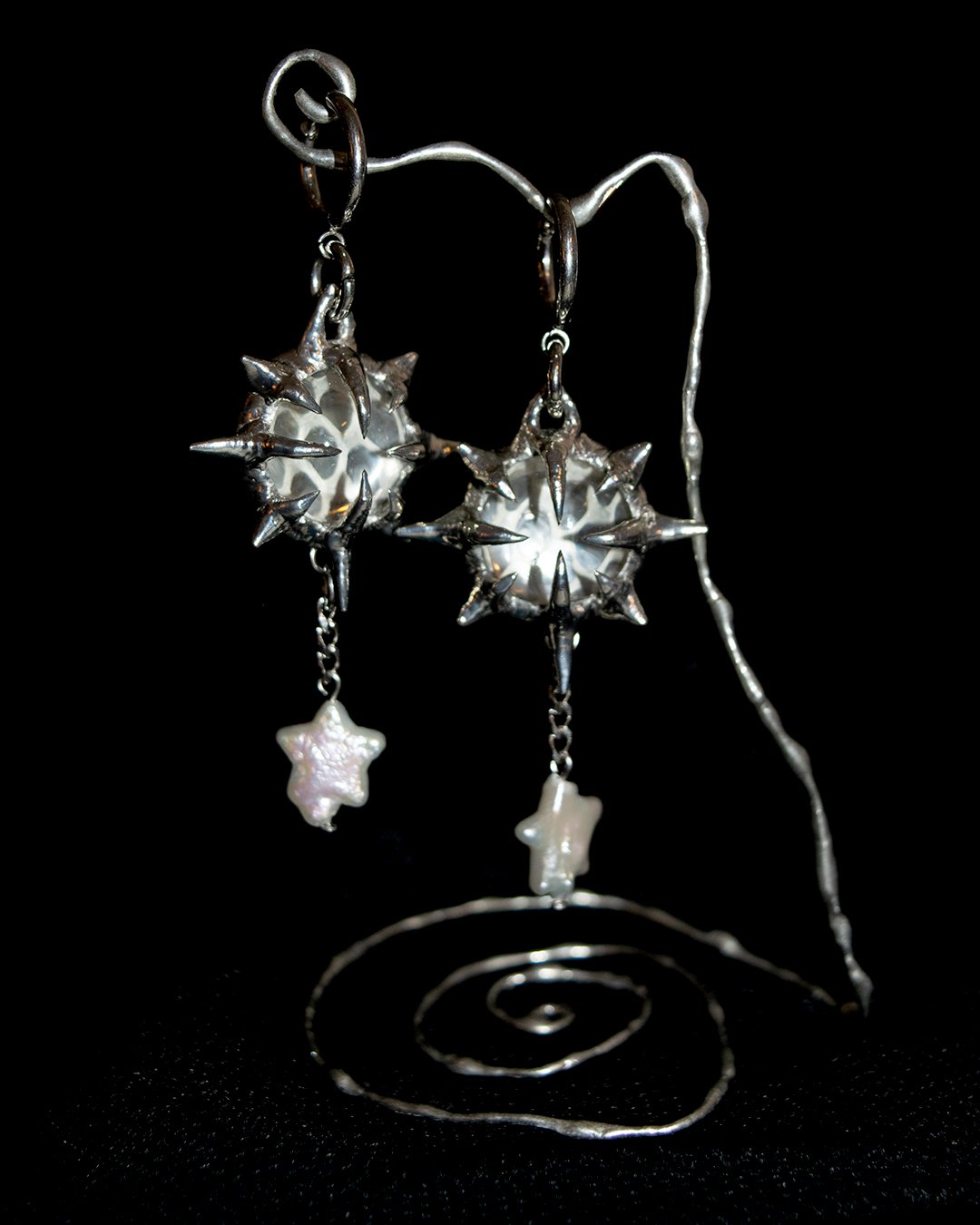 Made with snakeshed preserved beneath glass domes, lead-free tarnish-resistant solder (silver & tin), freshwater pearl stars, and 304 stainless steel huggies.