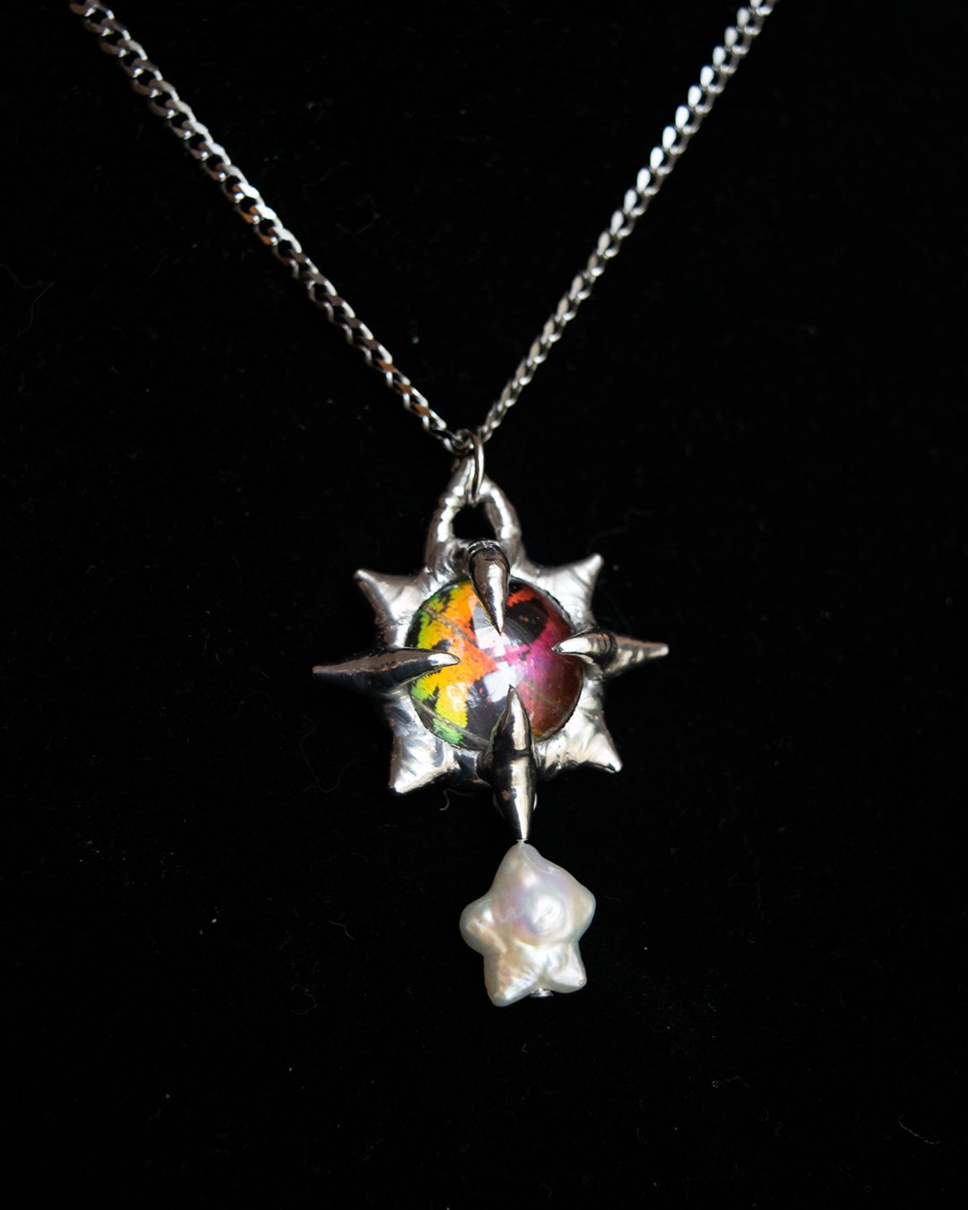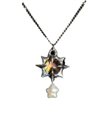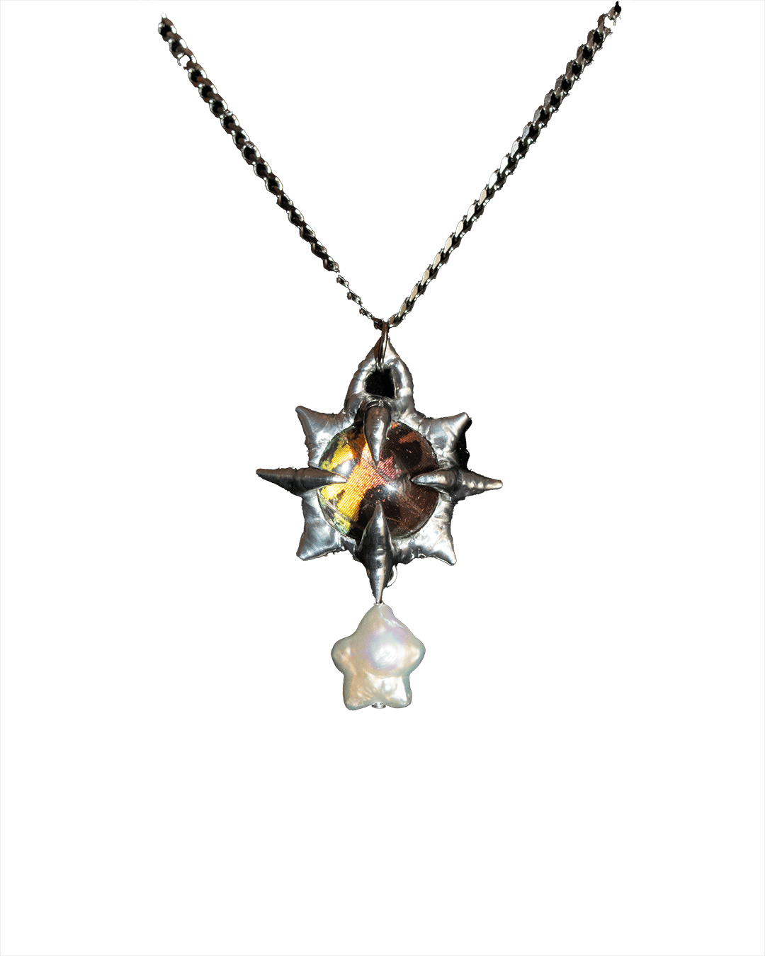 Made with a sunset moth wing preserved beneath a glass dome, a pearl star, lead-free tarnish-resistant solder (silver & tin) & 304 stainless steel chain/findings.