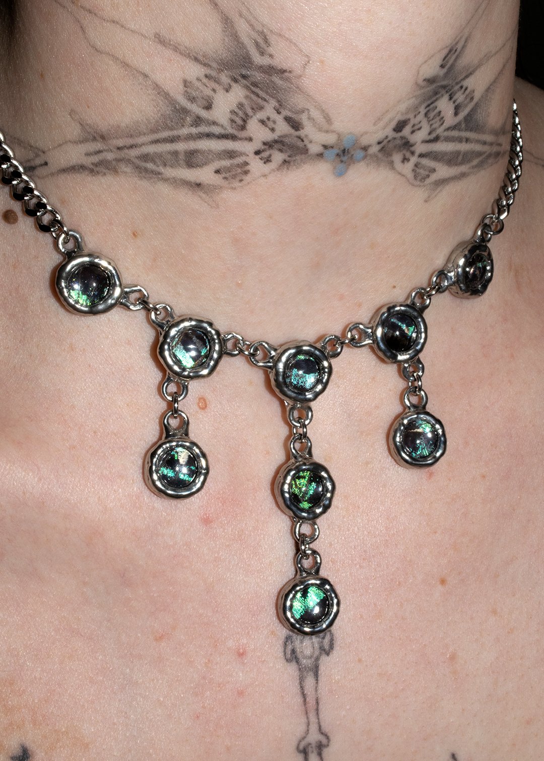 Made with sunset moth wing preserved beneath small glass domes, lead-free tarnish-resistant solder (silver & tin) & 304 stainless steel chain/findings.